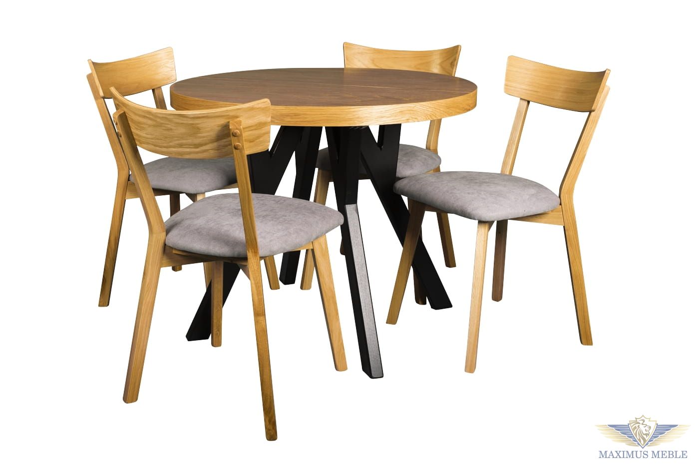 Stół okrągły Pająk i krzesła dębowe tapicerowany Olek